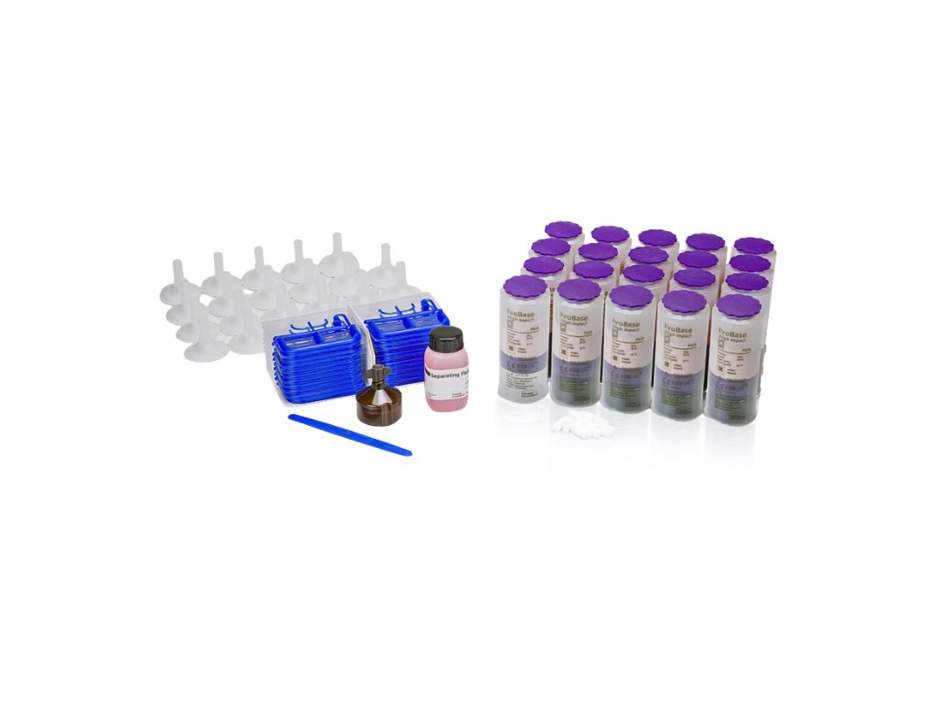 IvoBase High Impact kombinuje kvalitativní výhody teplem tuhnoucích polymerů s vlastnostmi při zpracování samo-tuhnoucích polymerů a tvoří tak novou kategorii pryskyřic na baze snímatelných náhrad. Materiál na bázi PMMA se zpracovává v injektoru IvoBase Injector. Odpovídá normě EN ISO 20795-1. Výhody: - Materiál velmi odolný vůči nárazu a zlomení - Vysoká přesnost dosednutí díky kompenzaci smršťování - Velmi nízký obsah zbytkového monomeru < 1% díky redukci zbytkového monomeru (RMR) - Vynikající vazebné vlastnosti s pryskyřičnými zuby - Vysoký základní lesk - Předem nadávkované kapsle - Délka polymerace: 50 minut